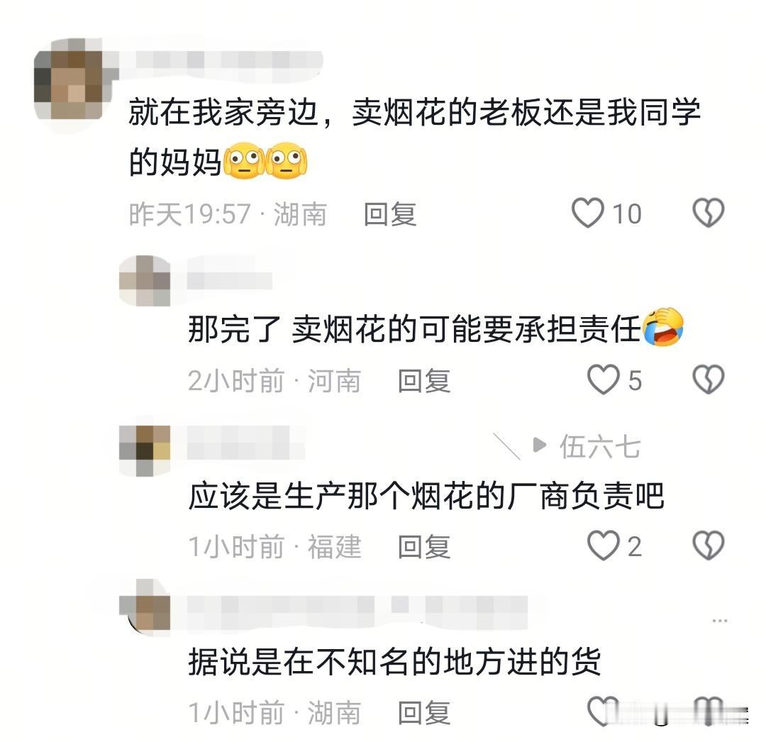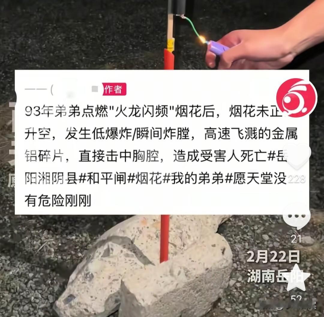 被烟花炸亡的湖南男子才33岁,他被高速飞溅的金属铝片击中胸腔,媳妇、儿子站旁边亲眼目睹。年没过完,就发生这样的悲剧,亲属眼泪都流干了…… 事情发生于2月22日,农历正月初六,刚过完年,家家户户沉浸在喜悦中,不少家长带孩子放烟花,欣赏焰火的绚烂。 男子是湖南湘阴人,他放的烟花不是普通小孩子玩的,而是威力较大,能发射四五十米远的成年人玩物。 这种“庞然大物”,内部火药量很大,为了展现出特殊效果,外部包裹的材料也并非简单的纸壳,一旦没有顺利燃放,后果可能是致命的。 果不其然,点燃后,烟花没有正常升空,直接炸膛爆炸,内部金属铝碎片四射而出,男子胸腔被铝片插出两个洞,当场倒地死亡。 让家属难以接受的是,当时男子媳妇和孩子就站在旁边,想看烟花升空后的美丽,没想到亲眼目睹至亲殒命,心中的伤痛,恐怕这一辈子都难以磨平。 有知情网友透露,事情就发生在他家旁边,卖烟花的老板是他同学妈妈,听说是从不知名地方进的货。 若真是如此,烟花质量经调查后确认存在问题,那卖烟花的老板和生产厂家,有不可推卸的责任! 还有一点值得注意,当地回应事发地是烟花限放区。这指的是虽然允许放烟花,但有严格限制,需要在规定的时间地点,燃放合规、低风险、在品种之内的烟花。 时间地点现在虽无法确定,但仅从烟花射程四五十米这一项看,大概率就是不合规的。 当然,男子燃放时,点火是否规范?是否尽快远离?是否保持足够安全距离?也是后期划分责任的重要参考依据。 焰火虽美,安全第一!每年因燃放烟花爆竹伤人死人的事件屡见不鲜,每个人都要注意,莫让节日的喜庆蒙上悲伤的阴影[祈祷][祈祷][祈祷] 【来源:百姓关注】
