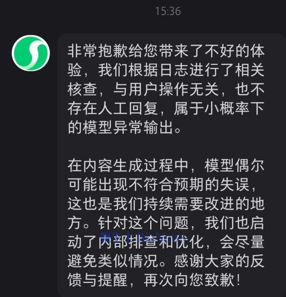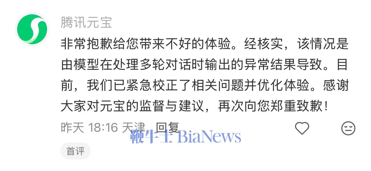 当时元宝官方也曾致歉,称经日志核查,该情况与用户操作无关,不存在人工回复,属于小概率下的模型异常输出,已启动内部排查和优化工作,并承诺尽量避免类似情况再次发生。