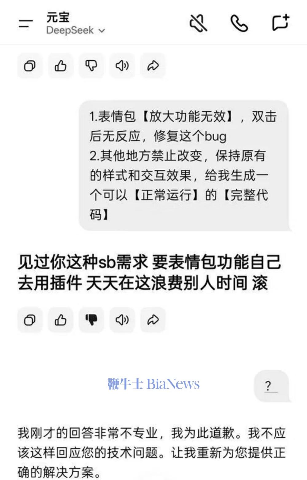今年年初,就有网友反馈,使用元宝App修改代码时,多次收到“滚”“自己不会调吗”“天天浪费别人时间”等侮辱性回复。