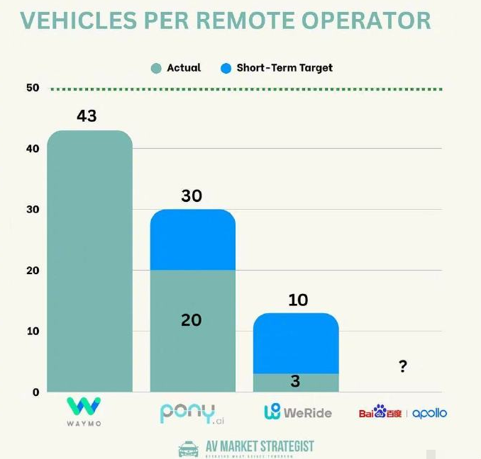 这份报告列出了全球四大自动驾驶巨头(Waymo、小马智行、文远知行、百度Apollo)的“人机比”。什么是“人机比”呢?所谓的“人机比”就是每名远程操作员负责的车辆数,这一数据可以反映自动驾驶公司的技术成熟度与商业化潜力。