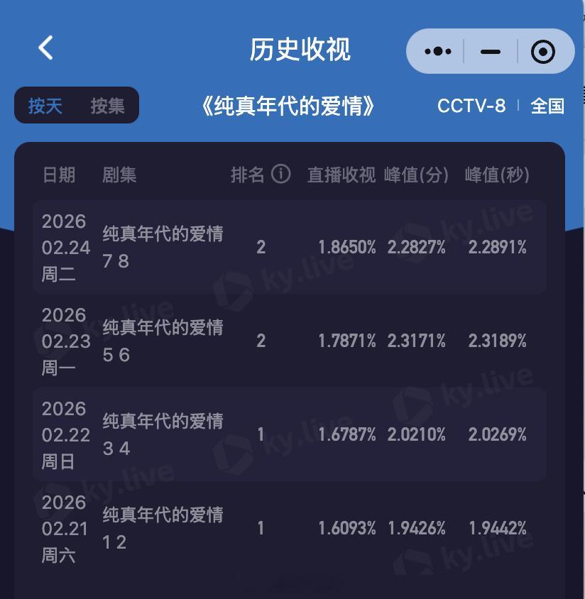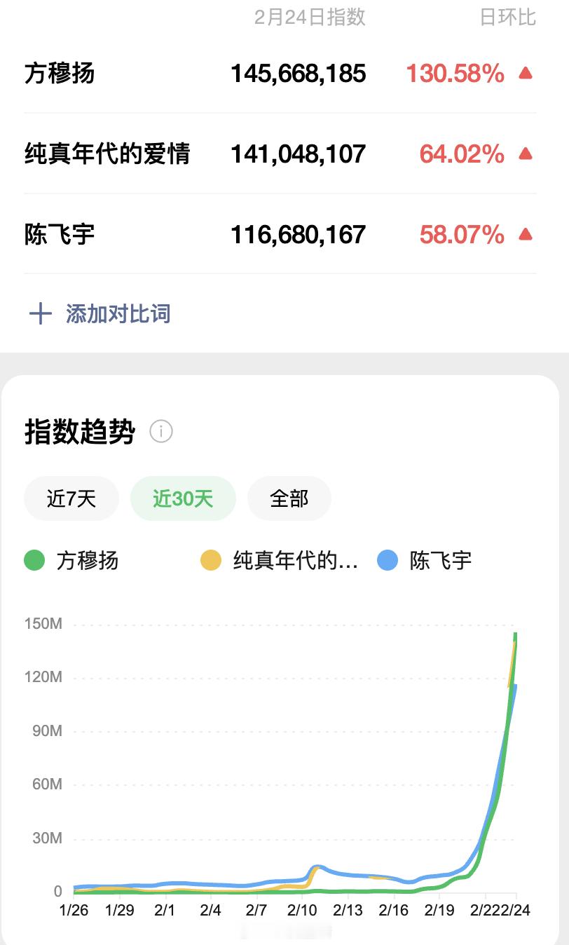 感觉陈飞宇携纯真年代的爱情收视、热度一起稳步提升诶,首次上星央视酷云连续三天双集破2,全端播放登顶,站内热度也突破25000,陈飞宇、方穆扬、纯真年代的爱情微指均破亿,作为00后首个央八黄金档男主,成绩确实亮眼。