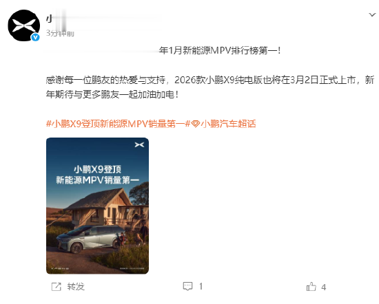 小鹏汽车官方微博今日宣布,小鹏X9荣获2026年1月新能源MPV排行榜第一。