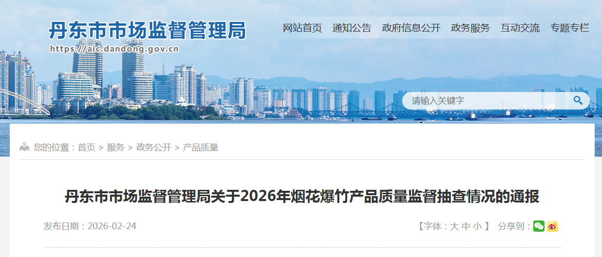 中国质量新闻网讯据辽宁省丹东市市场监督管理局网站消息,近日,丹东市市场监督管理局通报2026年烟花爆竹产品质量监督抽查情况。本次抽查烟花爆竹产品10批次,发现不合格经销单位1家1批次,不合格发现率为10.00%。