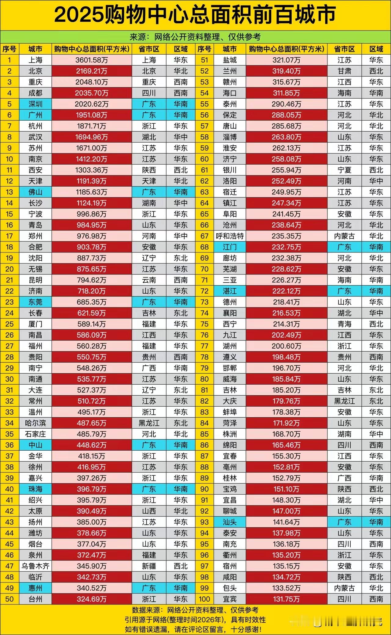 2025年购物总中心面积前一百城市排名情况,上海购物中心面积排名榜一,北京购物中心面积排名榜二,重庆购物中心总面积排名榜三,上海北京重庆这三座城市购物中心总面积排名最高,一共有100个城市上榜,上榜城市购物中心总面积都挺不错的,网友们可以看出自己家乡城市有没有能够上榜。