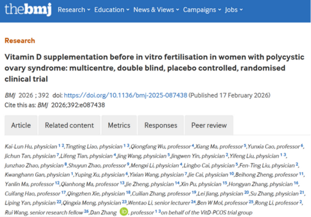 近日,浙江大学医学院附属妇产科医院在国际顶级医学期刊《英国医学杂志》(TheBMJ)上发表论文,为这个备受关注的问题提供了迄今为止最高级别的循证答案。这项由浙大妇院张丹教授团队领衔,悉尼大学NHMRC临床试验中心王睿高级研究员团队、北京大学第三医院李蓉教授团队等共同完成的研究发现:对于准备接受体外受精-胚胎移植辅助生殖技术(IVF-ET)的多囊女性,术前常规补充维生素D虽能显著提升血液中的维生素D水平,但并未显著提高最终的活产率。
