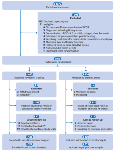 从2020年10月起,研究团队将876名符合条件、计划进行体外受精-胚胎移植的多囊卵巢综合征女性按1:1的比例随机分为两组:一组每天服用4000IU的维生素D,另一组则服用外观完全相同的安慰剂。两组均服药至取卵前的扳机日,最长服药时间达三个月。