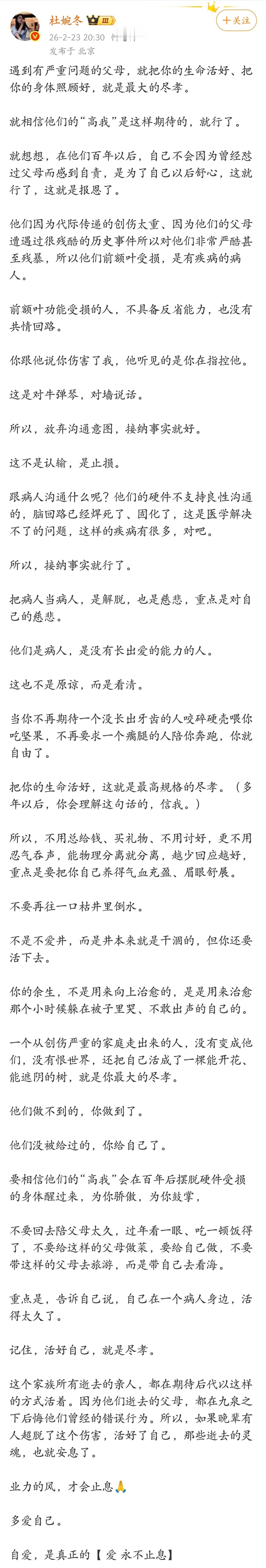 遇到有严重问题的父母,就把你的生命活好、把你的身体照顾好,就是最大的尽孝。