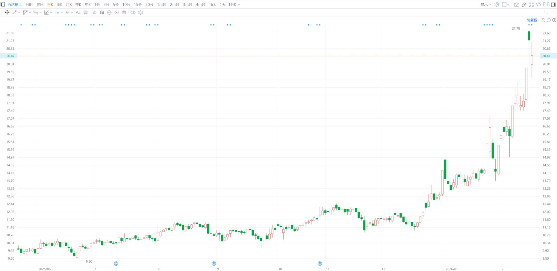 百达精工(603331.SH)现跌7.51%报19.7元,暂成交10亿元,最新市值39.8亿元;该股昨日盘中曾高见21.78元,股价创历史新高。百达精工发布异动公告,公司关注到近期部分媒体将公司列为机器人概念股,前述概念所涉业务收入占公司营业收入比例极低,尚未实现规模化销售,公司目前主营业务为压缩机零部件及汽车零部件的研发、生产和销售,主营业务未发生变化。公司股东杭州重湖拟自2026年2月26日至2026年5月25日通过集中竞价及大宗交易减持公司股份404.35万股,占公司总股本的2%。上述减持计划尚未实施完毕。(格隆汇)