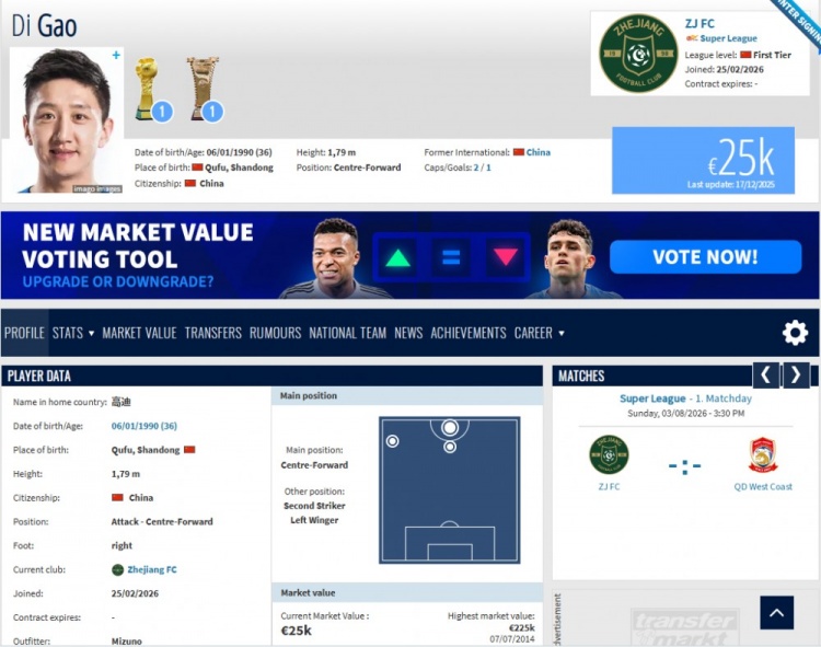 直播吧2月25日讯2025赛季结束后,高迪离开此前效力的青岛西海岸。“德国转会市场”信息显示,高迪已经重返老东家浙江队,这将是他第三次为浙江队效力。