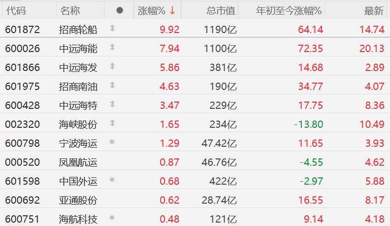 A股航运股集体走强,招商轮船涨停
