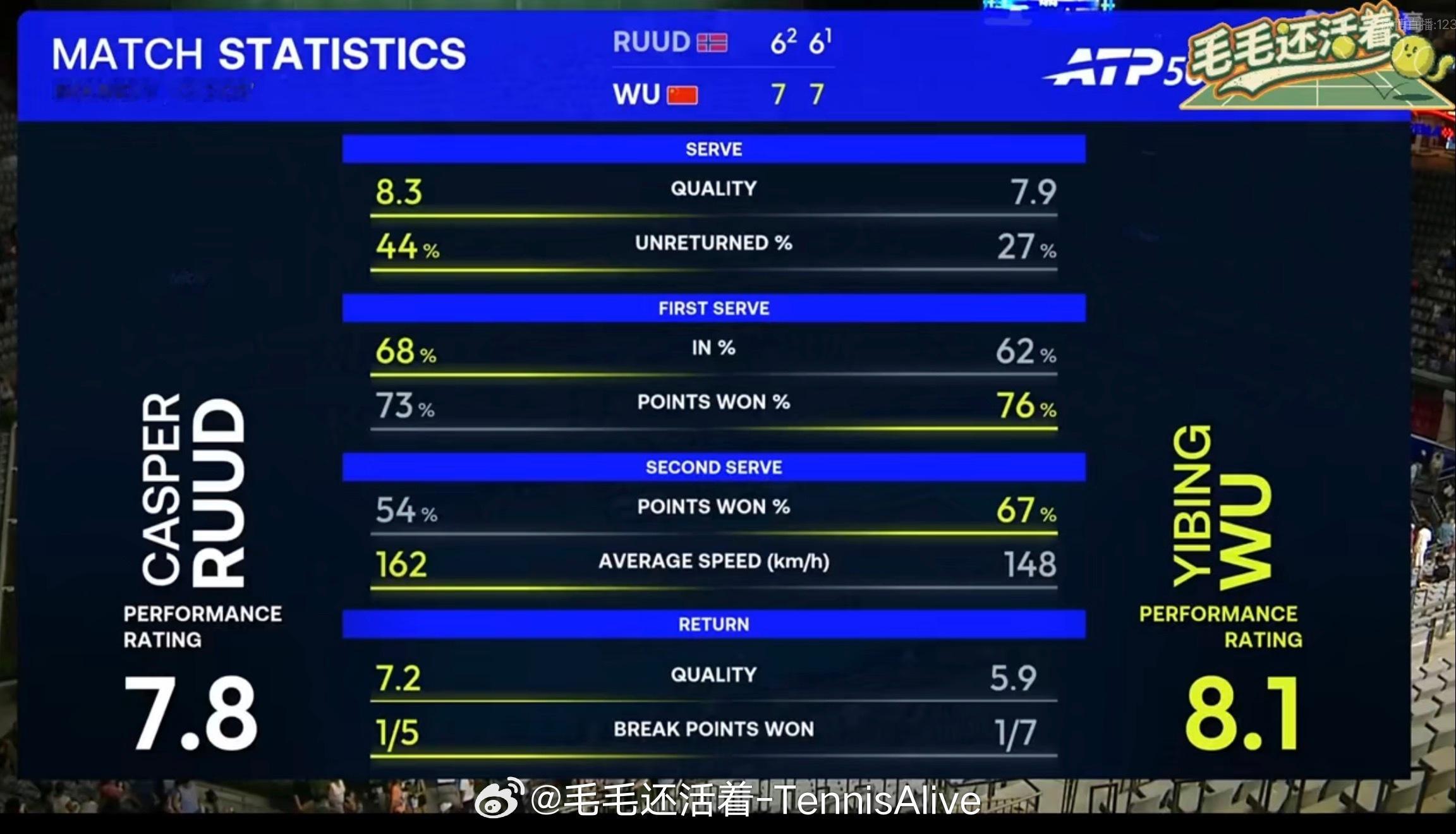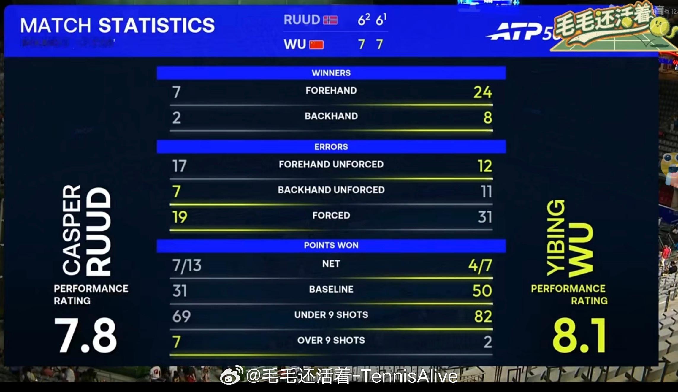吴易昺这场比赛完全展现了自己快节奏的打法。节奏压迫的鲁德来不及防守反击。底线击球节奏又快角度选择的也好。吴易昺帮助自己拿到top20的第三场胜利。