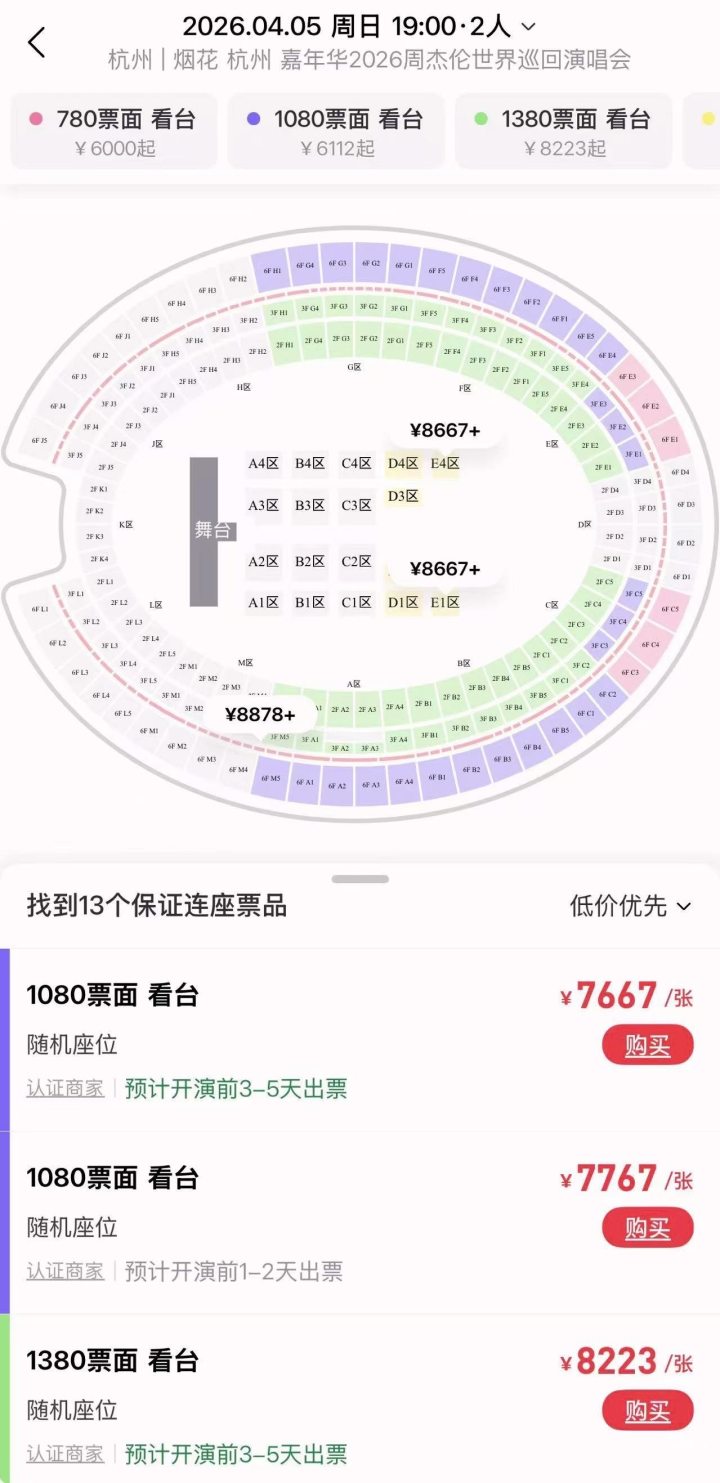 本次演唱会,最低票价为780元,比之前卖得都贵,但对于歌迷来说,贵不是问题,问题是抢不到。某代抢平台上,票面价格为1080元的看台票,标价超过7000元。