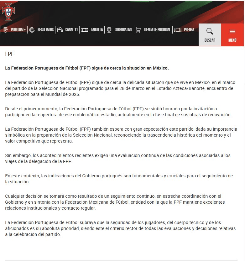 鉴于国家队将于3月28日在阿兹特克/巴诺特体育场进行比赛,这场比赛是备战2026年世界杯的重要一战,葡萄牙足协(FPF)正密切关注墨西哥当前局势的微妙变化。