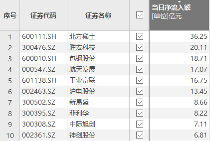 上证报中国证券网讯(刘禹希记者徐蔚)Choice数据显示,2月25日,资金净流入额排名前十的个股依次是北方稀土、胜宏科技、包钢股份、航天发展、工业富联、沪电股份、新易盛、菲利华、中际旭创、神剑股份。其中,北方稀土获净流入36.25亿元。