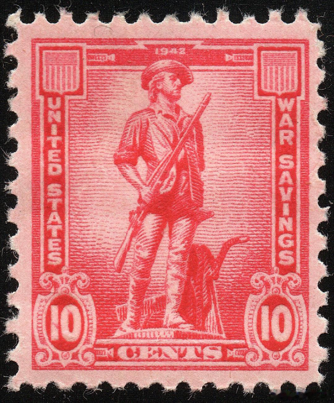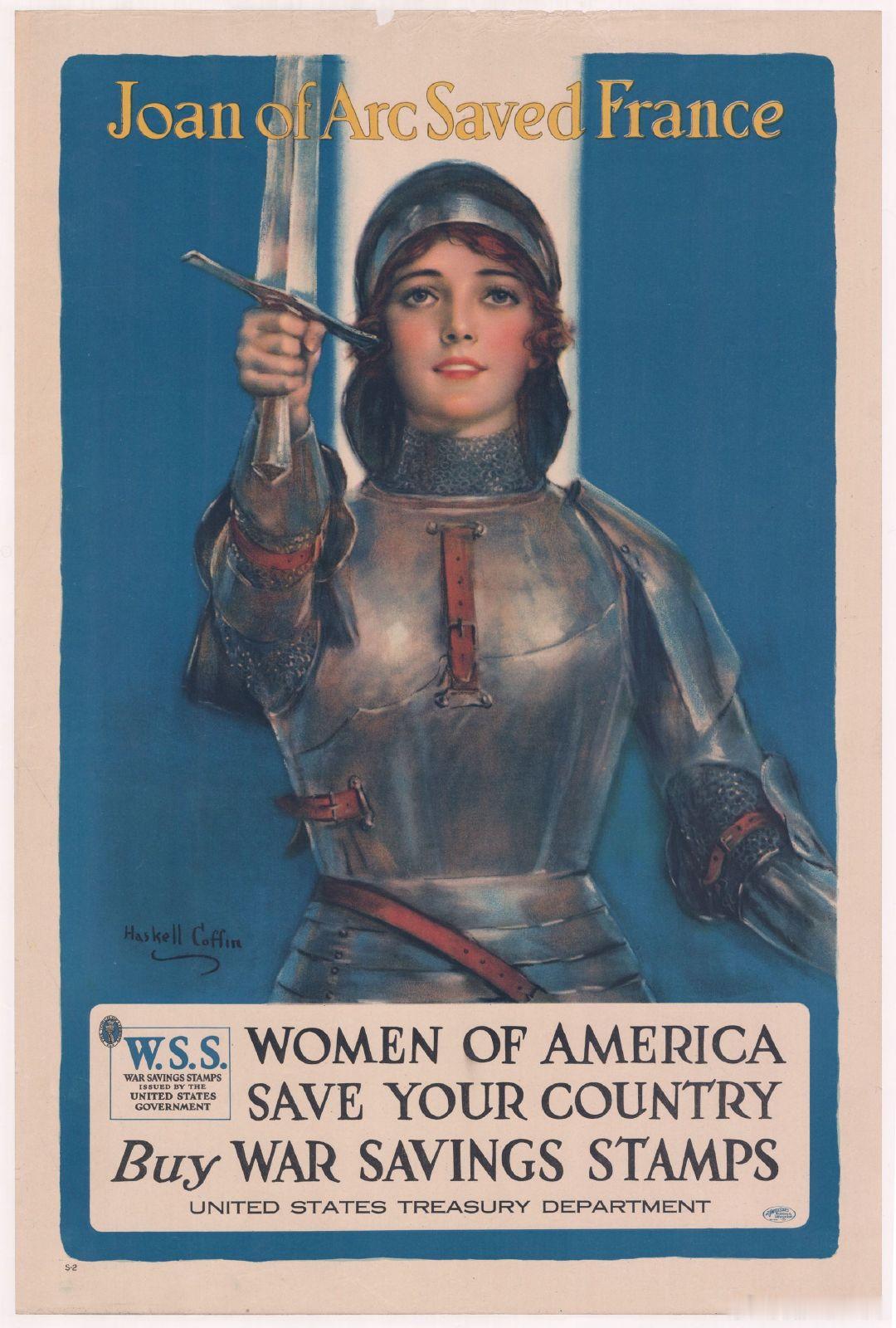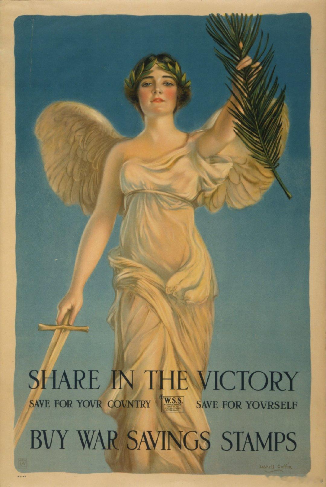 西洋历史文化鱼缸 历史知识 美国画家William Haskell Coffin(1878 – 1941)1918年的两幅宣传海报,挺有历史意义。虽然画面上分别是欧洲的胜利女神和圣女贞德,但实际宣传内容却是鼓动民众积极购买美国的战争储蓄邮票(War savings stamps of the United States)。美国政府一战的战争支出约320亿美元,为了筹集军资,1917年底发行了第一批战争出巡邮票,实际售价约4.12美元(需实名购买),1923年1月1日到期时,可按照面值五美元售出。美国在一战期间共售出9.2亿美元的战争储蓄邮票。图3是1918年纽约民众购买邮票的情景。图4是二战期间美国发行的战争储蓄邮票。