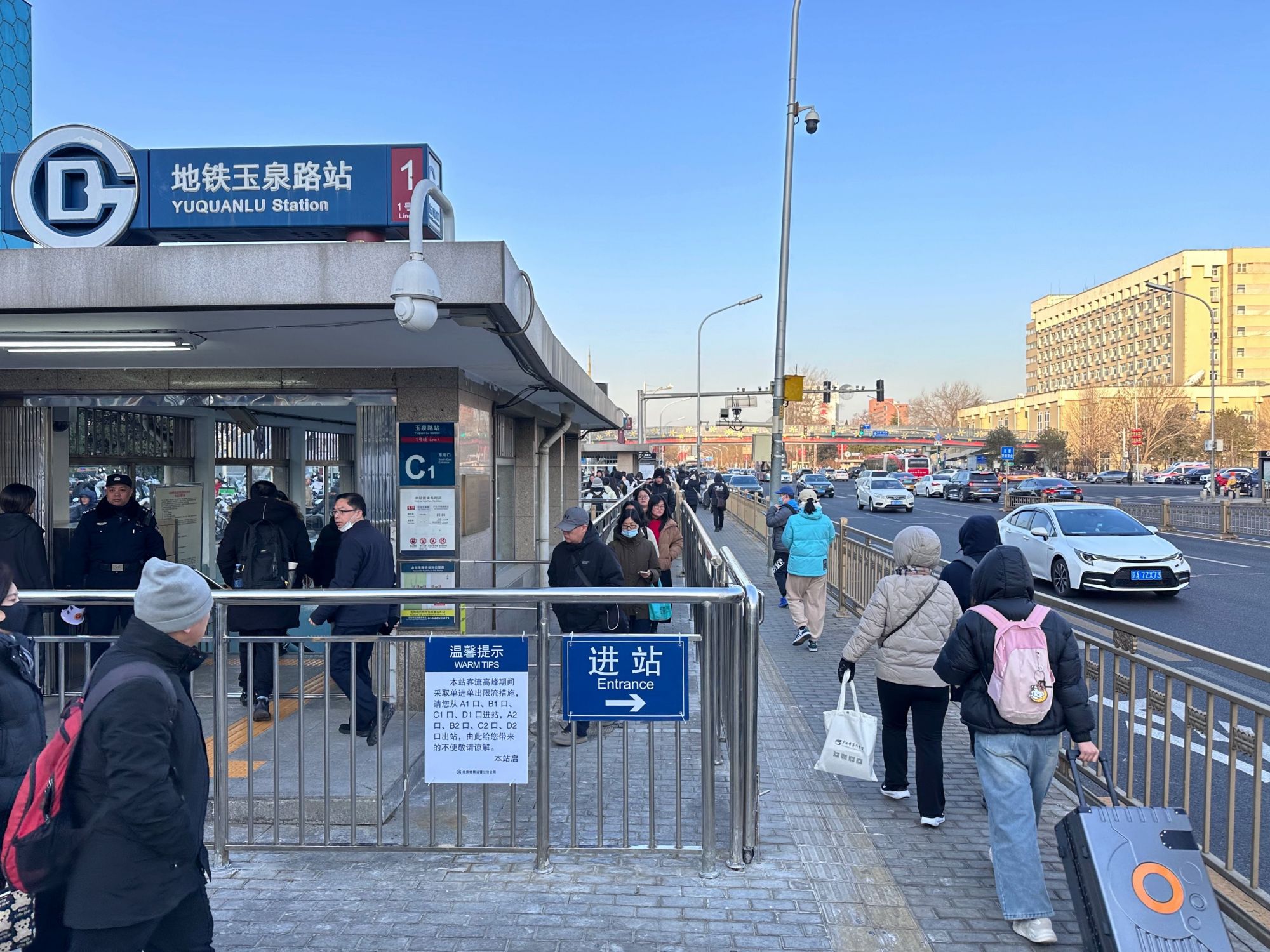 2月24日,早高峰时段,乘客在玉泉路站C1口排队进站。新京报记者王贵彬摄