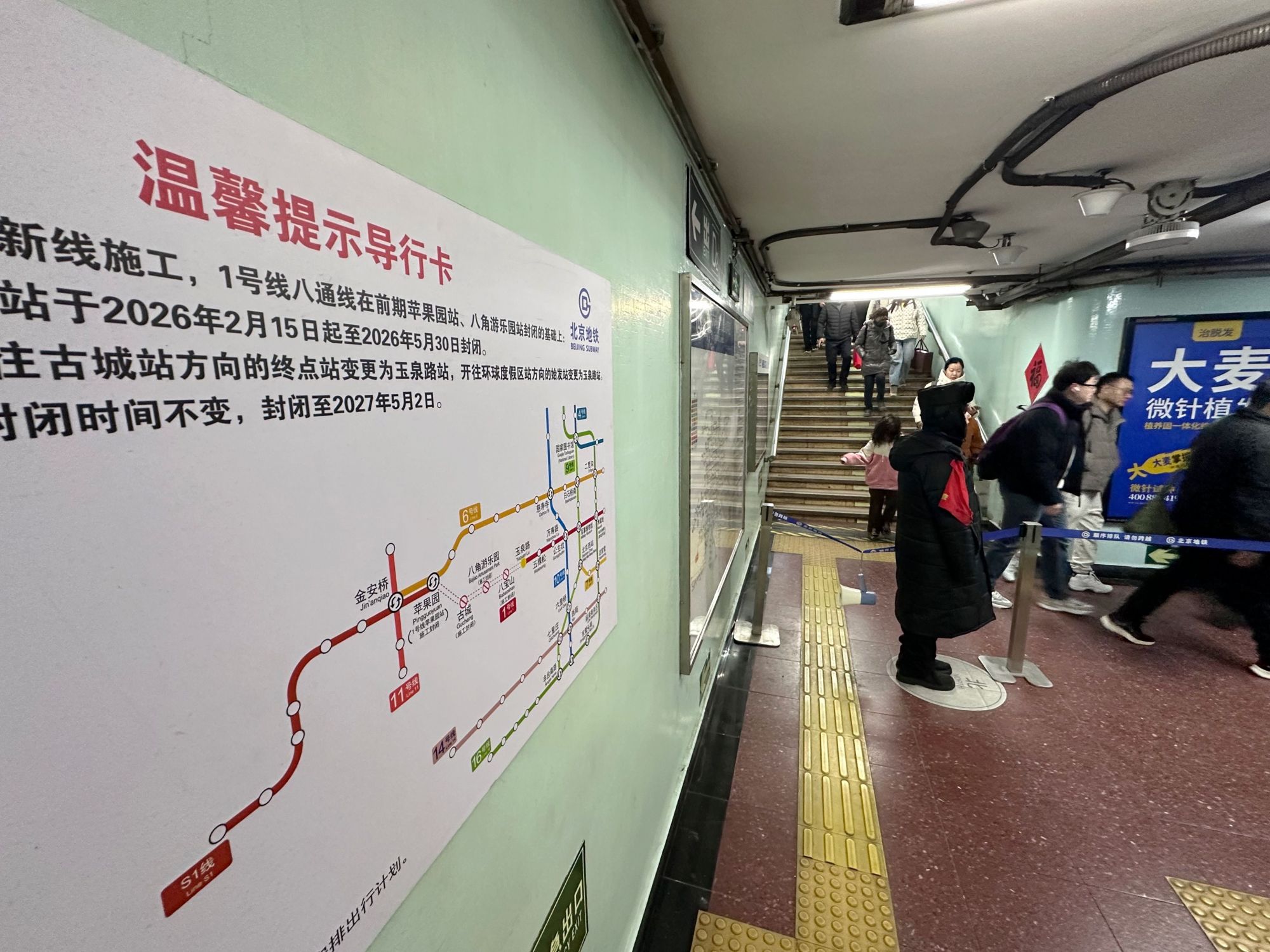 为配合地铁1号线支线建设,自2月15日起,1号线古城站、八宝山站采取临时封站停运措施,预计持续至2026年5月底。为何建设1号线支线,在前期已经封站停运八角游乐园站的基础上,又要封闭另外这两站?目前1号线支线的施工进展如何?今天上午,京投轨道公司相关负责人进行了释疑。