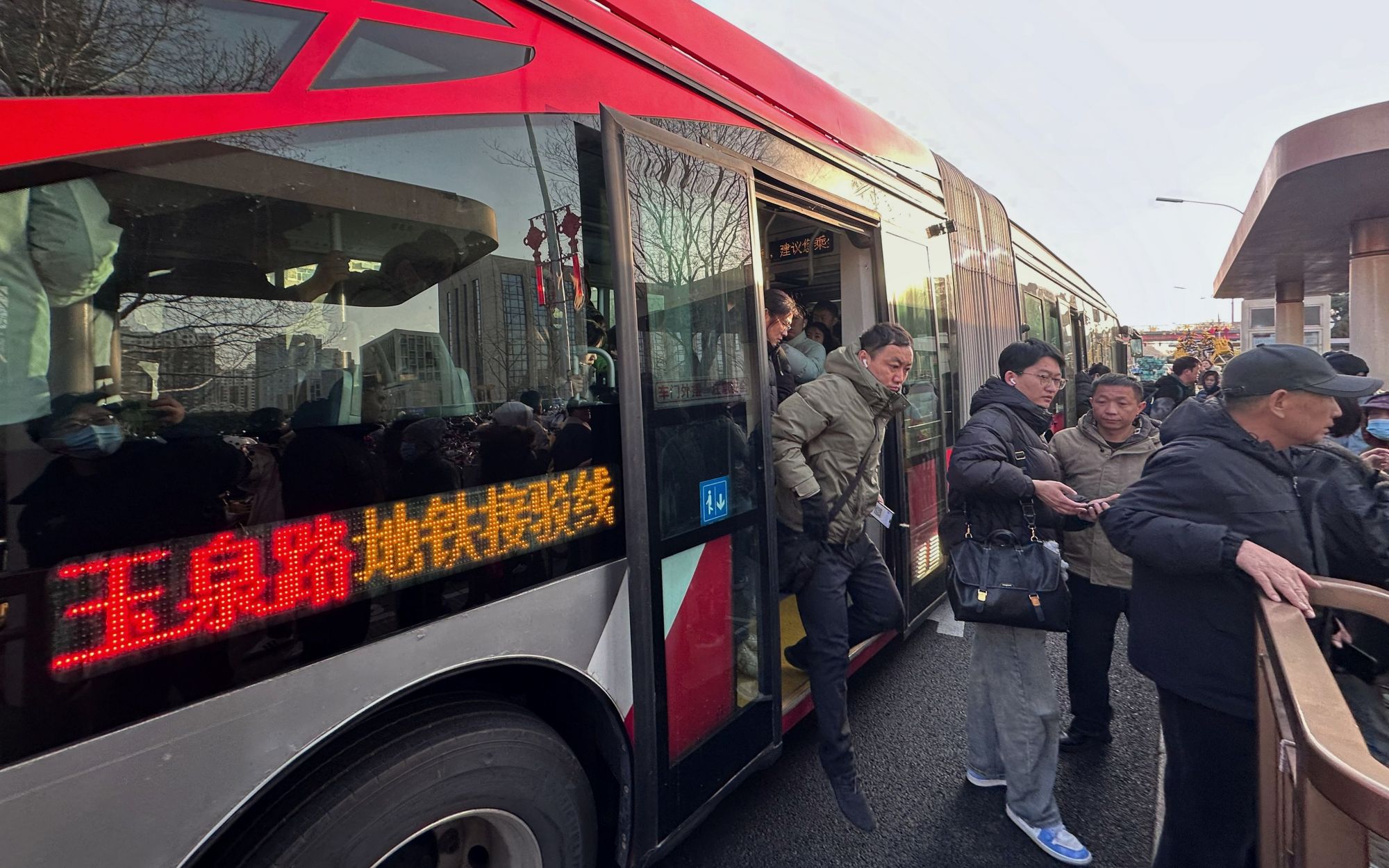 2月24日早高峰时段,市民乘坐地铁接驳临线公交抵达玉泉路地铁站。新京报记者王贵彬摄