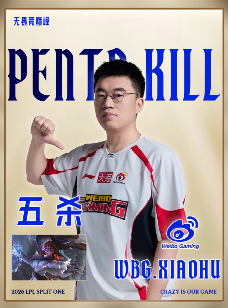 这是2026LPL第一赛段的第三个五杀,也是Xiaohu在LPL职业生涯的第二个五杀,恭喜Xiaohu!