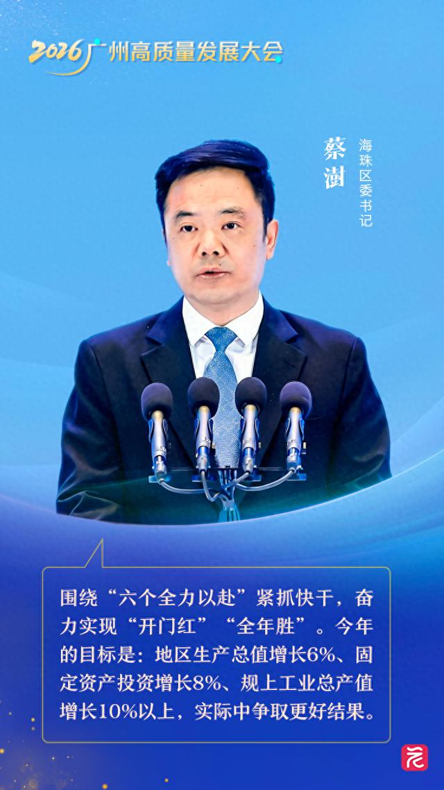 2月25日,广州市高质量发展大会召开,再度擂响出征的战鼓,勃发开局即冲刺、全年都加力的昂扬气象。会上,海珠区委书记蔡澍表示,新春伊始,市委、市政府就召开大会,吹响“开局就要冲刺”的号角。海珠区将围绕“六个全力以赴”紧抓快干,奋力实现“开门红”“全年胜”。今年的目标是:地区生产总值增长6%、固定资产投资增长8%、规上工业总产值增长10%以上,实际中争取更好的结果。