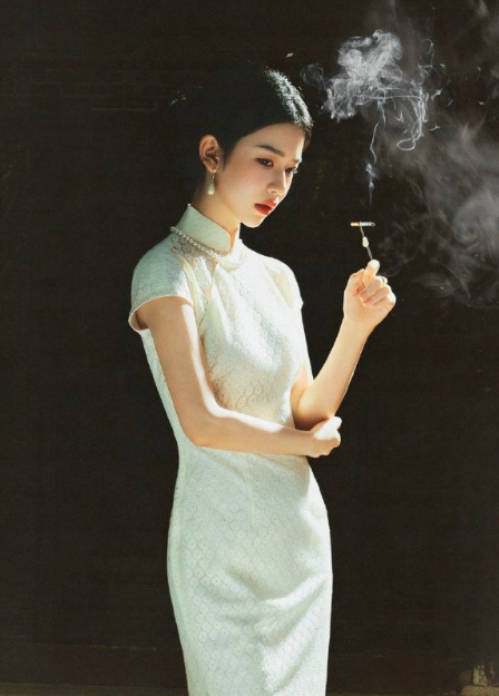 旗袍雅致衬娇容,白底牡丹显风情。玉珠圆润,风情万种。贴身裁剪,凸显性感。