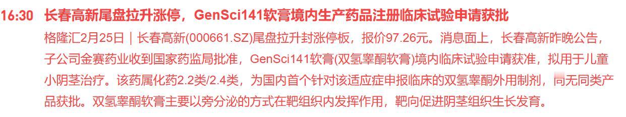 原来长春高新下午尾盘突然直线拉涨,原因是这个! 长春高新昨晚公告,子公司金赛药业收到国家药监局批准,GenSci141软膏(双氢睾酮软膏)境内临床试验申请获准,拟用于儿童小阴茎治疗。该药属化药2.2类/2.4类,为国内首个针对该适应症申报临床的双氢睾酮外用制剂,尚无同类产品获批。双氢睾酮软膏主要以旁分泌的方式在靶组织内发挥作用,靶向促进阴茎组织生长发育。 长春高新的这个产品确实不错,估计市场空间挺广! 我想帮朋友问问,这个产品,大人能用吗? 如果大人也能用,那市场空间得多大?我想答案是想都不能想。那得有多少成年大朋友会去尝试? 如果这个逻辑有的话,估计今天这个涨停还少了。 就看这个逻辑成立不成立了!