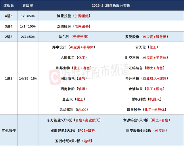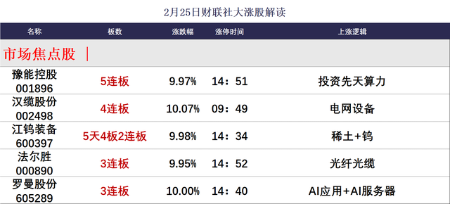 财联社2月25日讯,今日75股涨停,35股炸板,封板率为68%,豫能控股5连板,汉缆股份4连板,罗曼股份、法尔胜3连板,江钨装备5天4板。市场高开高走,午后小幅回落后再度拉升,创业板指、深成指均涨超1%。沪深两市成交额2.46万亿,较上一个交易日放量2605亿。盘面上,市场热点快速轮动,全市场超3700只个股上涨。板块方面,小金属、稀土永磁、房地产、化工板块领涨;影视、银行、AI应用、煤炭板块领跌。截至收盘,沪指涨0.72%,深成指涨1.29%,创业板指涨1.41%。