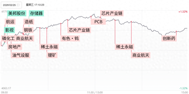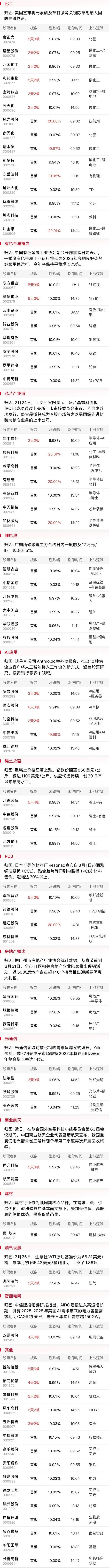 连板晋级率57.14%,高位股整体分化态势依旧,虽然4进5的豫能控股在内的多只连板股实现晋级,但盘中均呈现巨量换手,而另一只4连板个股美邦股份盘中上演“天地板”。春节假期前人气高涨的影视、传媒板块亏钱效应依旧,博纳影业、横店影视、掌阅科技遭遇2连跌停。与此同时,涨价概念除去化工、有色齐头并进外,钢铁、建材等低位方向展开补涨,此外铜箔、电子布等PCB产业链上游也再度迎来爆发。不过算力租赁、存储芯片等热门科技方向大批人气品种也展开逆势调整,在科技股内部博弈加剧之际,市场风偏短期改善仍较为有限。