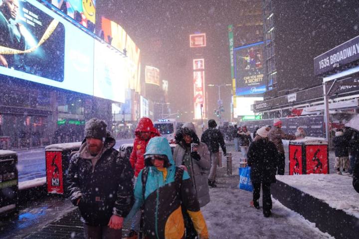 2月22日,在美国纽约,人们走在时报广场积雪的路面上。新华社记者张凤国摄