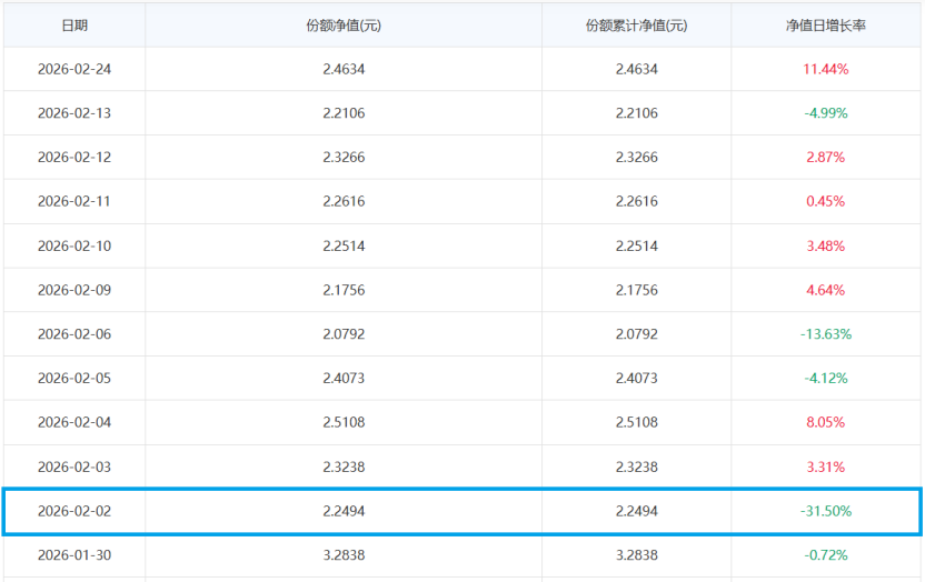 更严重的是,国投瑞银基金的估值调整决策出现了严重滞后。1月30日国际银价暴跌后,公司并未及时调整估值,直到2月2日收盘后才突然发布公告,参考国际市场收盘变动幅度进行估值调整,直接将国投白银LOF的当日净值跌幅从-17%下调至-31.5%,创下公募基金产品单日净值的跌幅纪录。