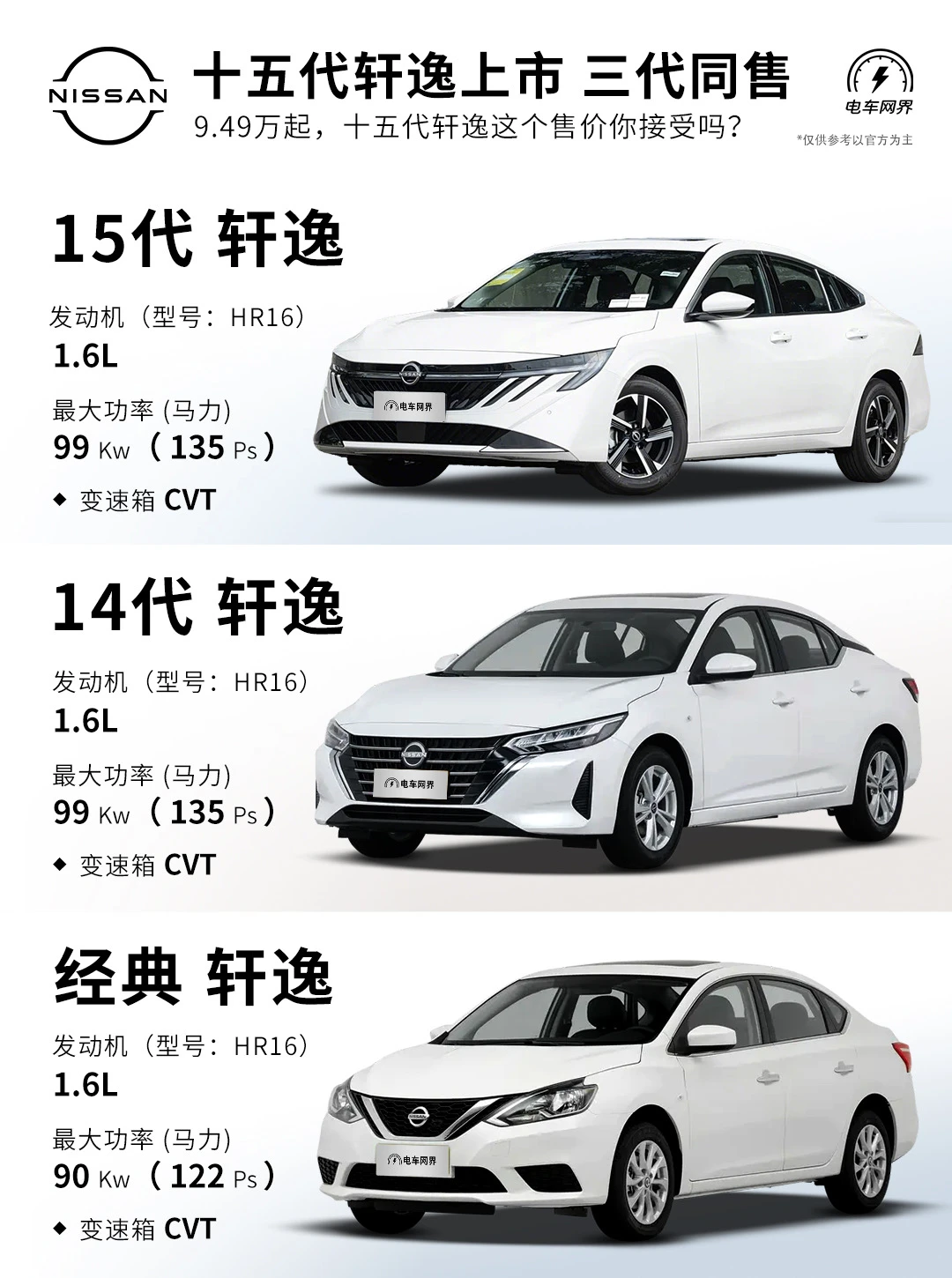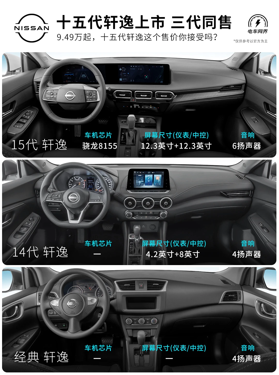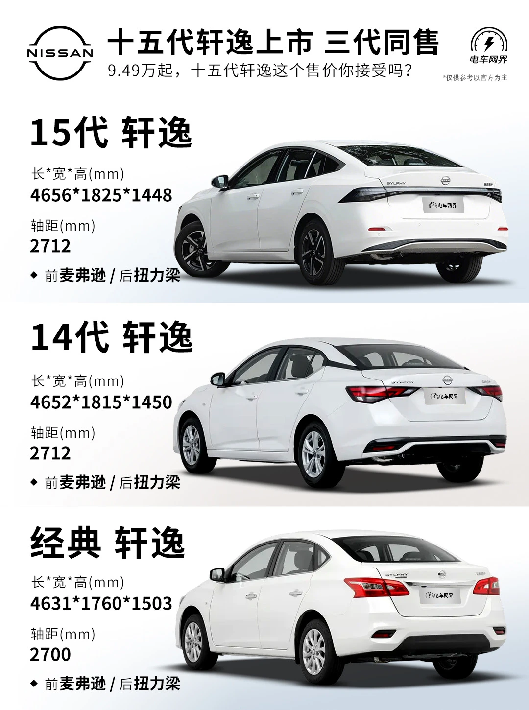 新上的15代轩逸起售价为9.49万,14代轩逸价格是7.49万,经典轩逸(13代