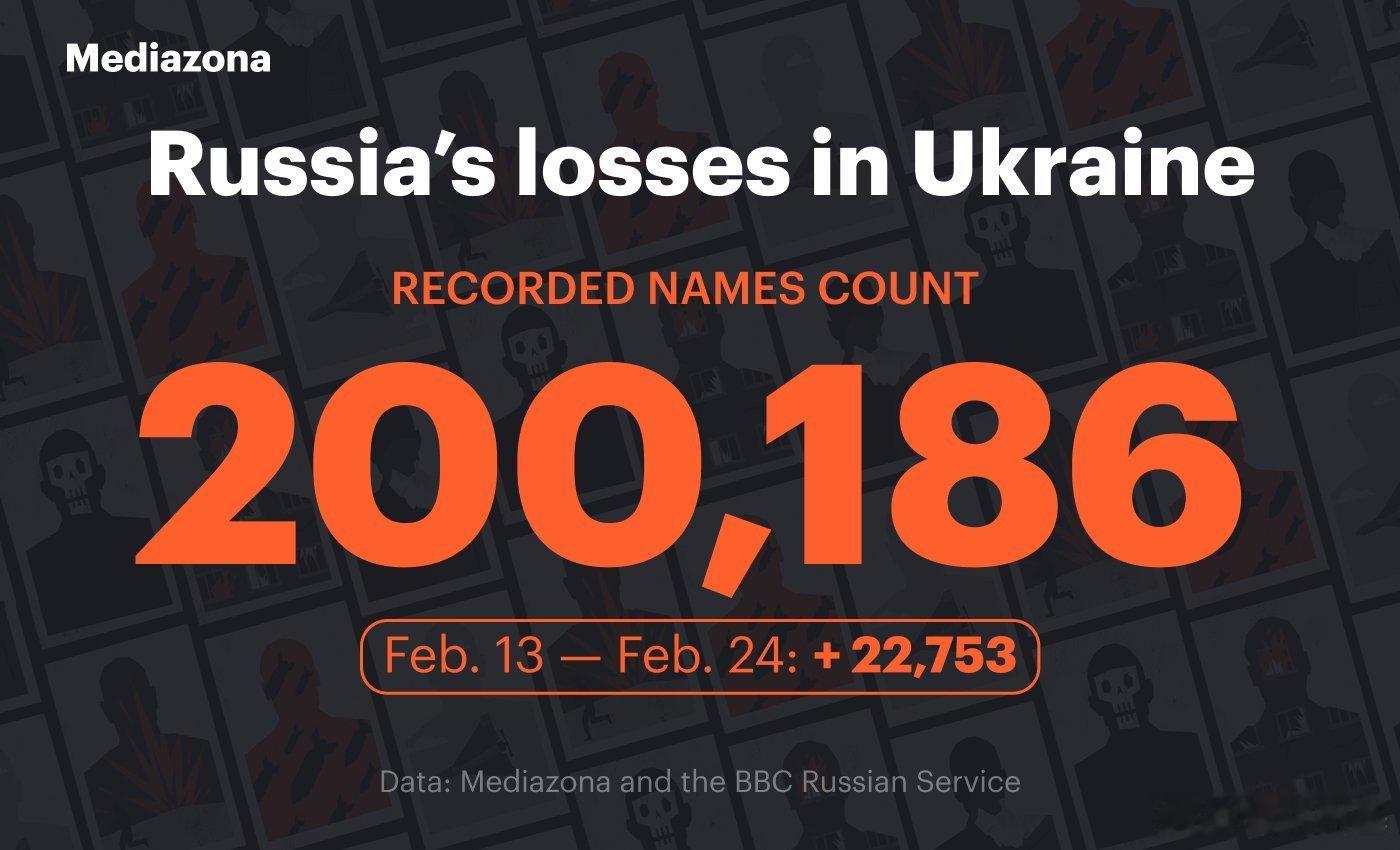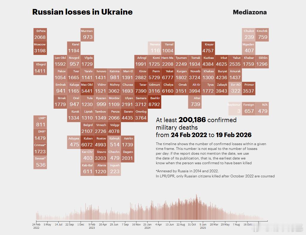 🇷🇺🇺🇦 俄罗斯反对派媒体Mediazona发布截至20260224俄军阵亡数据:200,186。整体俄方阵亡柯基按照超额死亡率推算约26万,而伤亡人次已经到了78万。