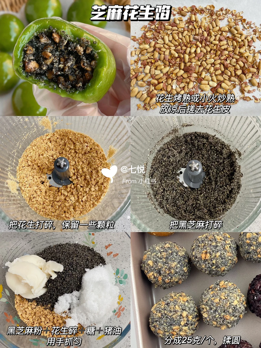 ▪️黑芝麻粉+花生碎+糖+猪油用手抓匀,分成25g/个揉圆