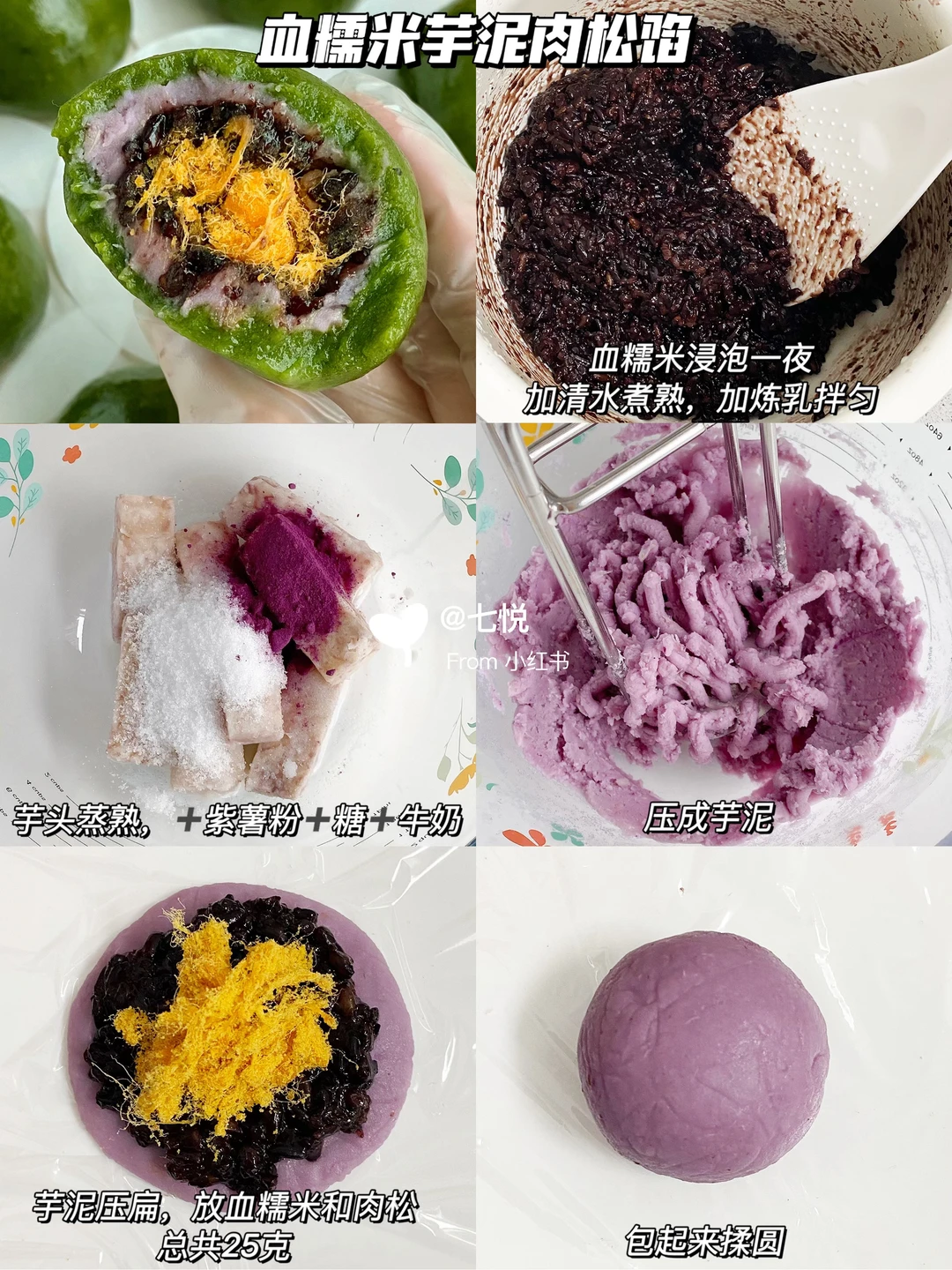 🔅血糯米150g(煮熟后),炼乳适量,芋头200g,紫薯粉2.5g,糖16g,牛奶少许,肉松适量