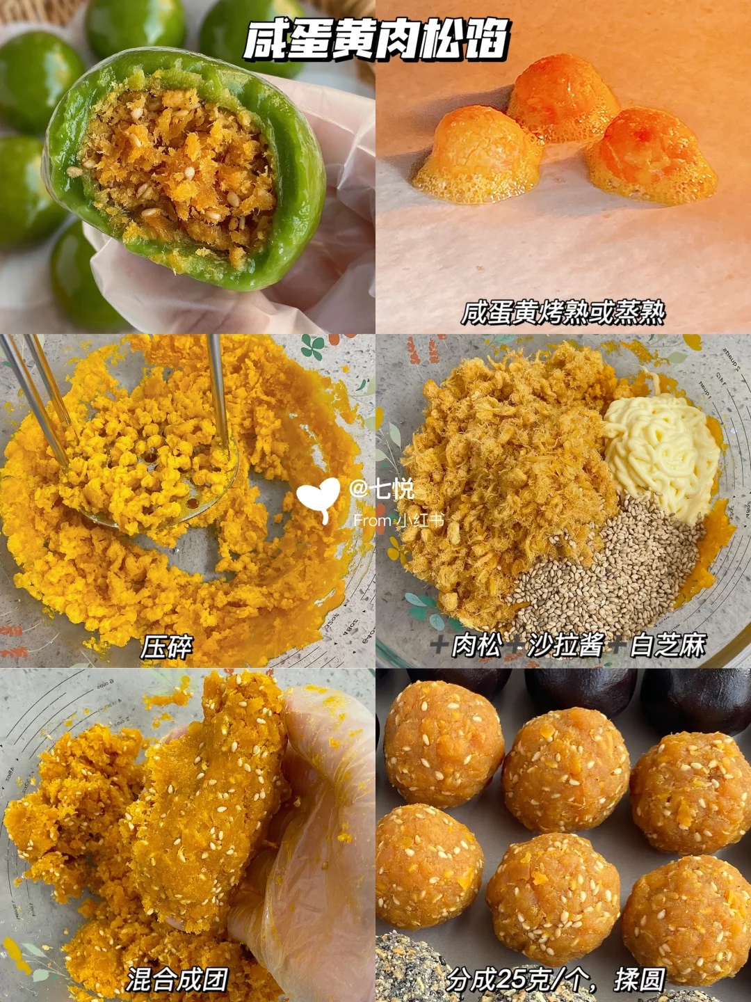 ▪️+肉松+沙拉酱+白芝麻,混合成团,分成25g/个揉圆