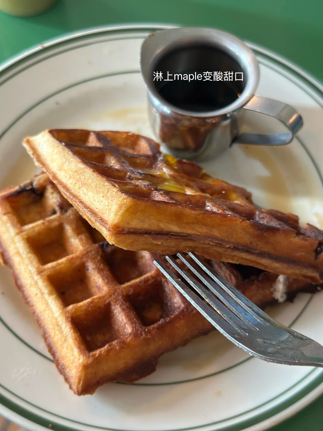 华夫饼里面有一颗颗蓝莓夹心,淋枫糖浆是酸甜口,不淋就是完全甜口