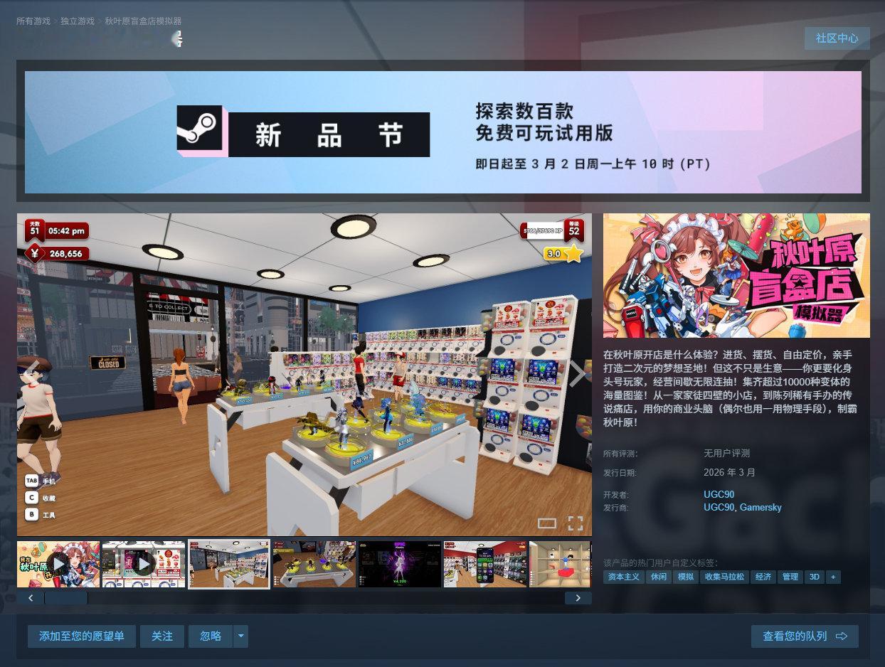 休闲模拟经营游戏《秋叶原盲盒店模拟器》将于3月登陆Steam,支持中文,商店页面有免费试玩Demo。