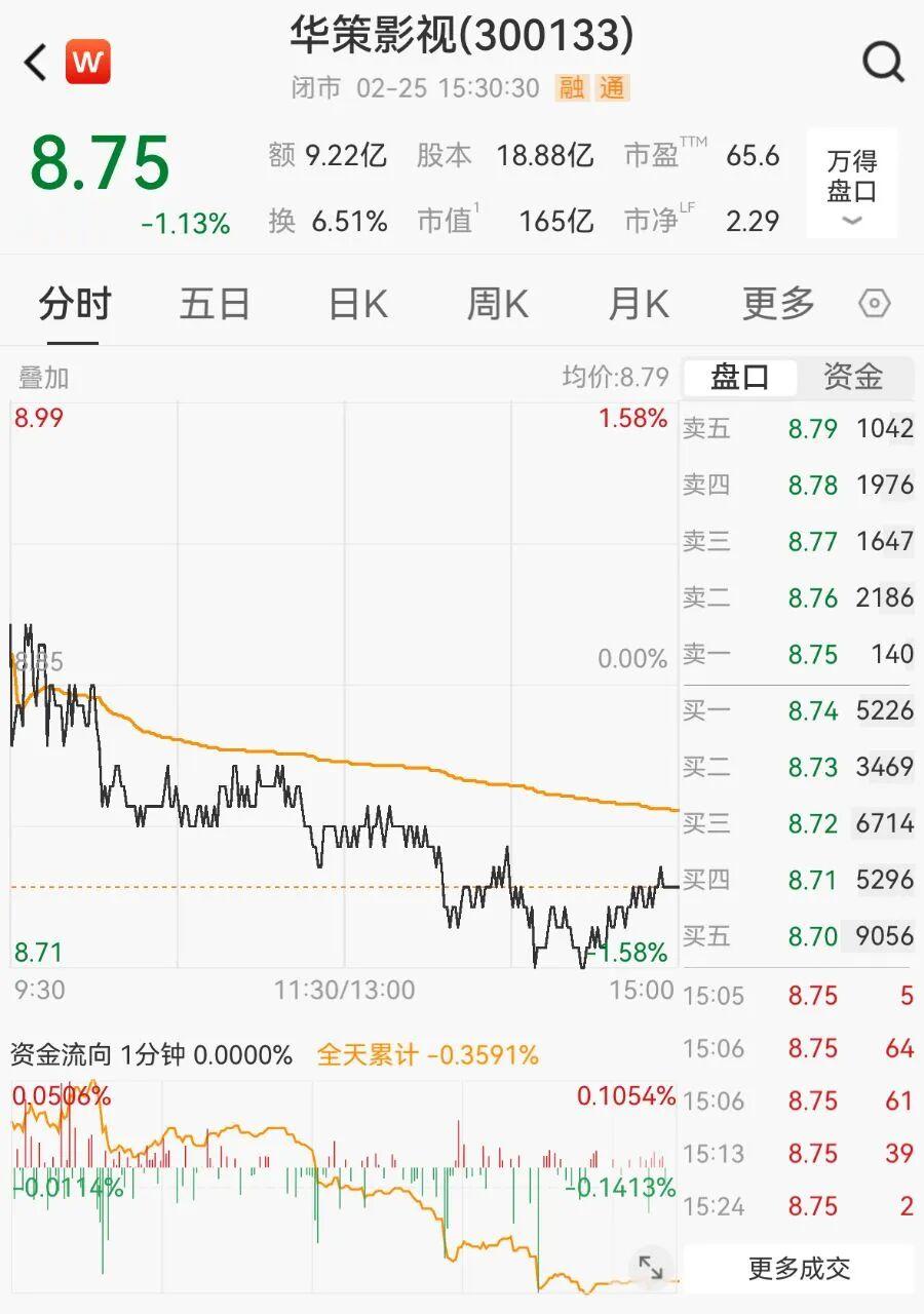 截至2月25日收盘,华策影视股价已5连跌,报8.75元/股,跌1.13%,总市值为165亿元。