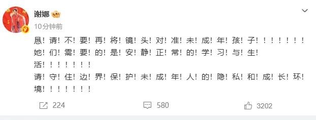 25日午间,谢娜发文呼吁恳请不要再将镜头对准未成年孩子,“请守住边界保护未成年人的隐私和成长环境”,并连发68个感叹号。