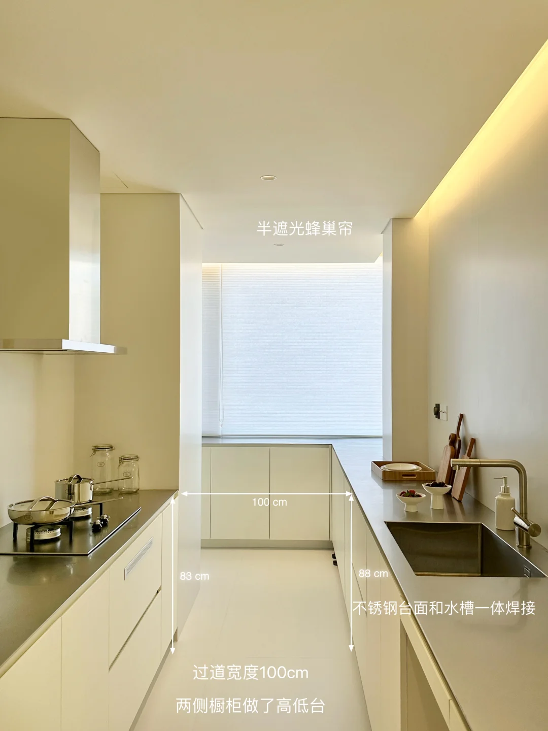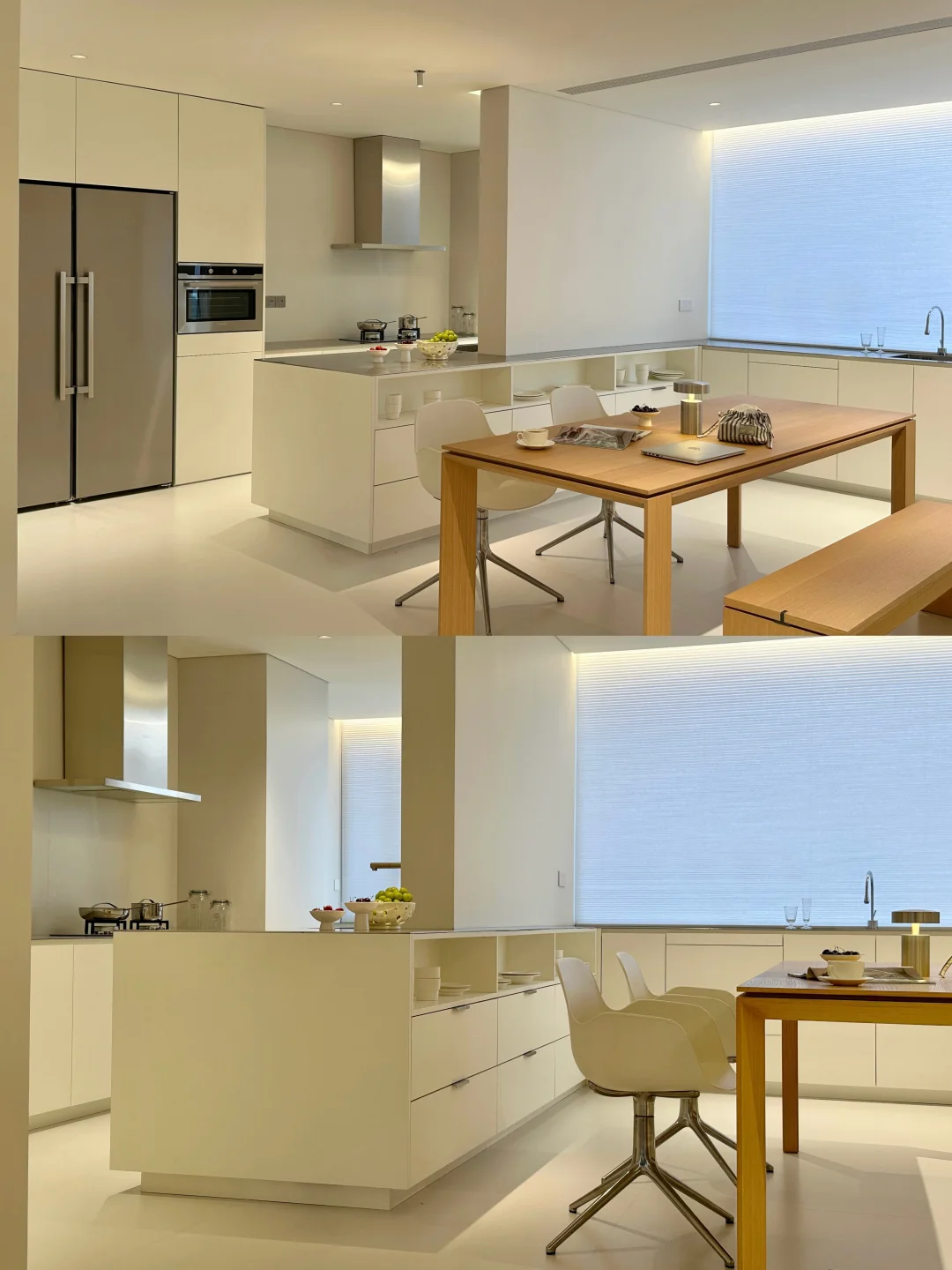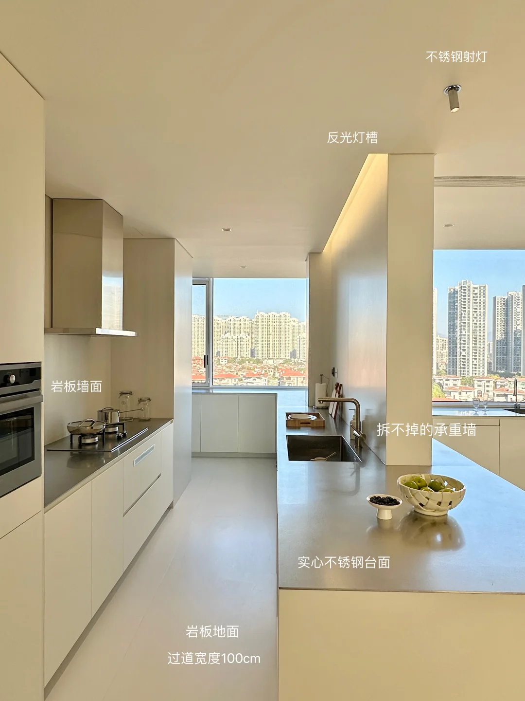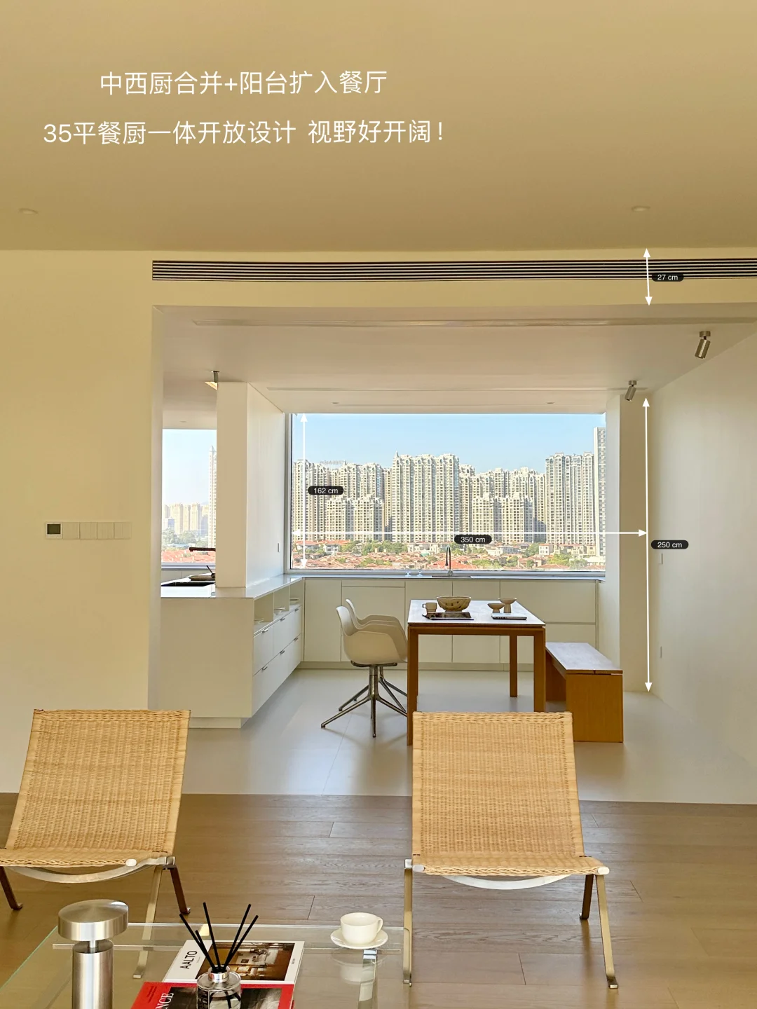 这里是的新家 我家装修最花心思一定是餐厨区 从设计阶段就疯狂刷韩系家居案例 历时一年,终于实现了我的梦中情厨🎉 整理了一些实用的装修干货,喜欢的宝子来抄作业啦! [种草R] 格局改造: 砸掉非承重墙,中西厨合并+阳台扩入餐厅,35平的客餐厨一体开放设计,视野好开阔 围绕承重墙定制3米超长岛台,下方做开放式格,常用餐具随手拿取,既是收纳区也是展示区✨ [种草R] 材质搭配: 放弃压抑吊柜,奶白色橱柜+不锈钢台面+同色不锈钢厨电,清冷又不失温度 不锈钢台面与水槽一体焊接,无卫生死角 墙地铺贴大尺寸岩板,缝隙少,打理更省心 [种草R] 氛围: 全景大玻璃把窗外的开阔视野和城市风景框进厨房,做饭时都觉得格外舒服 搭配简约的蜂巢帘,窗帘盒暗藏灯带一打开,温柔又有层次 装修过程真的踩了无数坑[汗颜R] 关于我家厨房,还有想了解的欢迎评论区留言