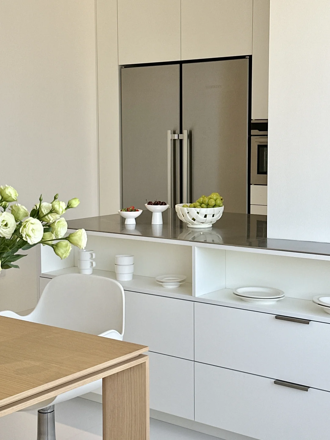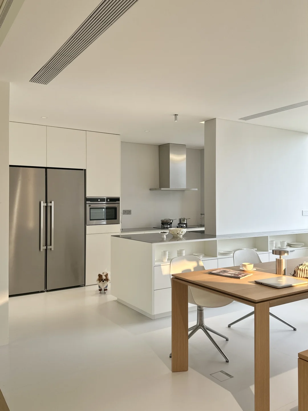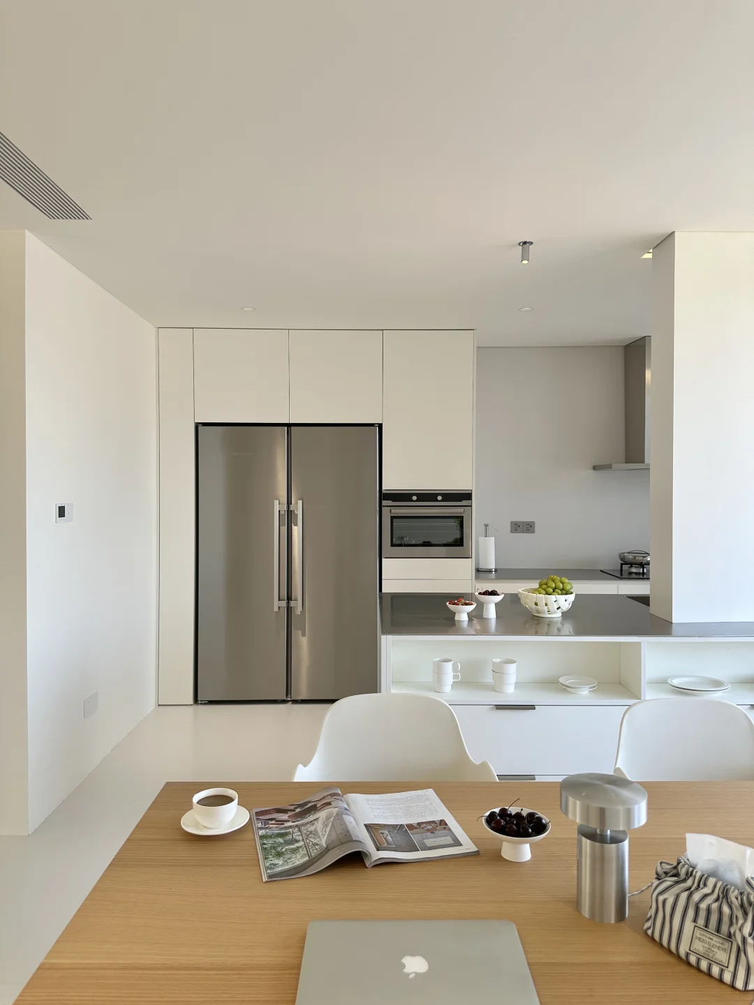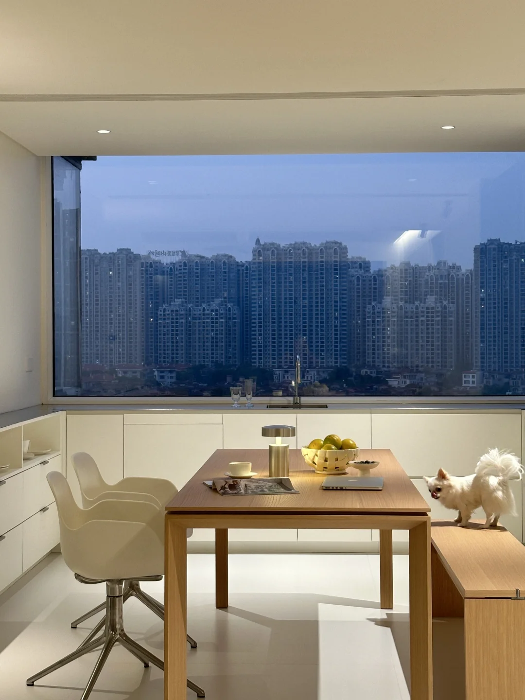 这里是的新家 我家装修最花心思一定是餐厨区 从设计阶段就疯狂刷韩系家居案例 历时一年,终于实现了我的梦中情厨🎉 整理了一些实用的装修干货,喜欢的宝子来抄作业啦! [种草R] 格局改造: 砸掉非承重墙,中西厨合并+阳台扩入餐厅,35平的客餐厨一体开放设计,视野好开阔 围绕承重墙定制3米超长岛台,下方做开放式格,常用餐具随手拿取,既是收纳区也是展示区✨ [种草R] 材质搭配: 放弃压抑吊柜,奶白色橱柜+不锈钢台面+同色不锈钢厨电,清冷又不失温度 不锈钢台面与水槽一体焊接,无卫生死角 墙地铺贴大尺寸岩板,缝隙少,打理更省心 [种草R] 氛围: 全景大玻璃把窗外的开阔视野和城市风景框进厨房,做饭时都觉得格外舒服 搭配简约的蜂巢帘,窗帘盒暗藏灯带一打开,温柔又有层次 装修过程真的踩了无数坑[汗颜R] 关于我家厨房,还有想了解的欢迎评论区留言