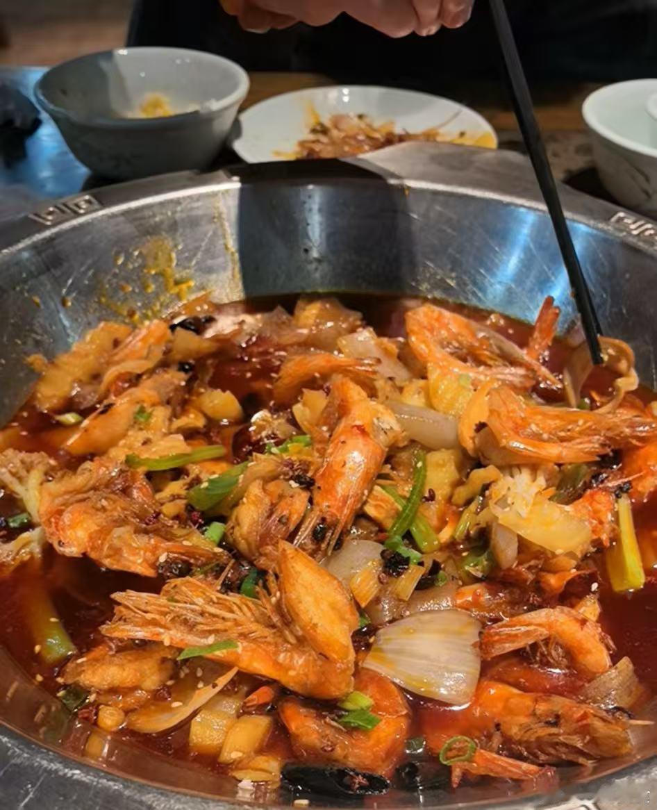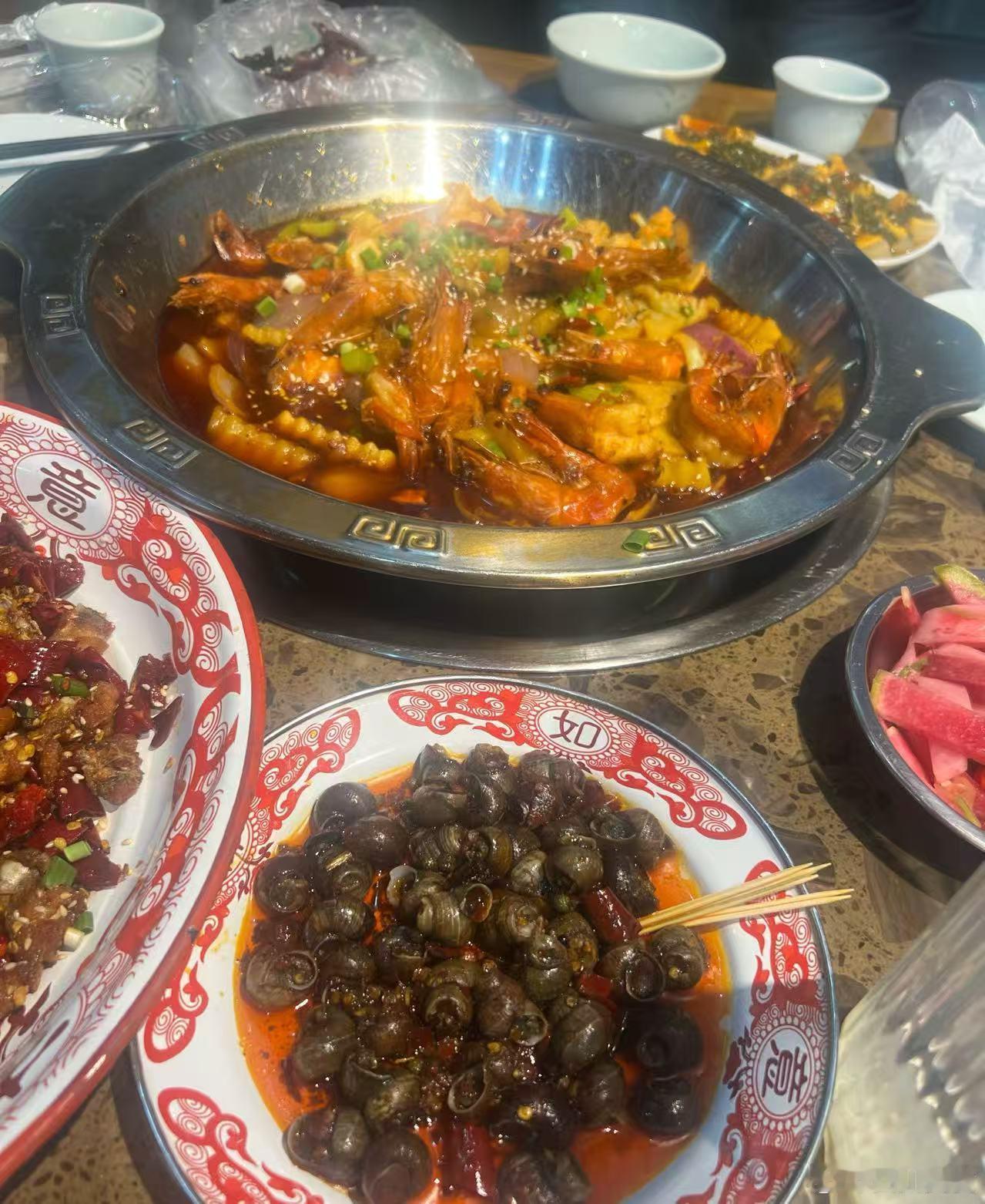 金彭大虾:开了很多年的老店,会送一盘小螺丝,最大的特色就是干锅虾,蟹虾很新鲜,虾线都挑出来了,配菜也多,微辣也会有点辣,份量足,整理来说味道和性价比都合适。