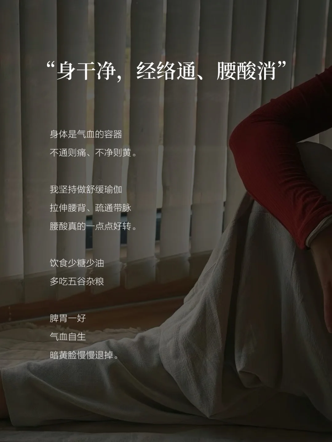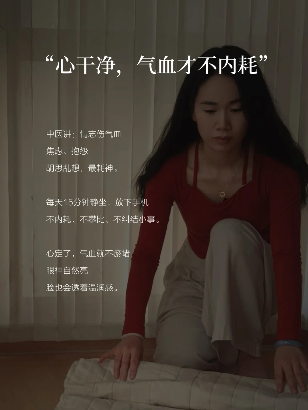 那段时间真的很丧,觉得自己又老又累,完全没有灵气。后来我靠着食疗调理+瑜伽拉伸+每日静坐,一点点把气血养回来。