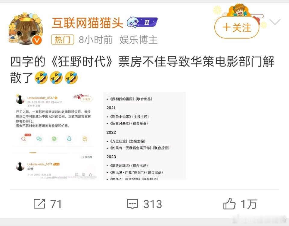 华策 狂野时代有博主爆料,电影扑街后续……这部烂片集结了全明星阵容,易烊千玺还分