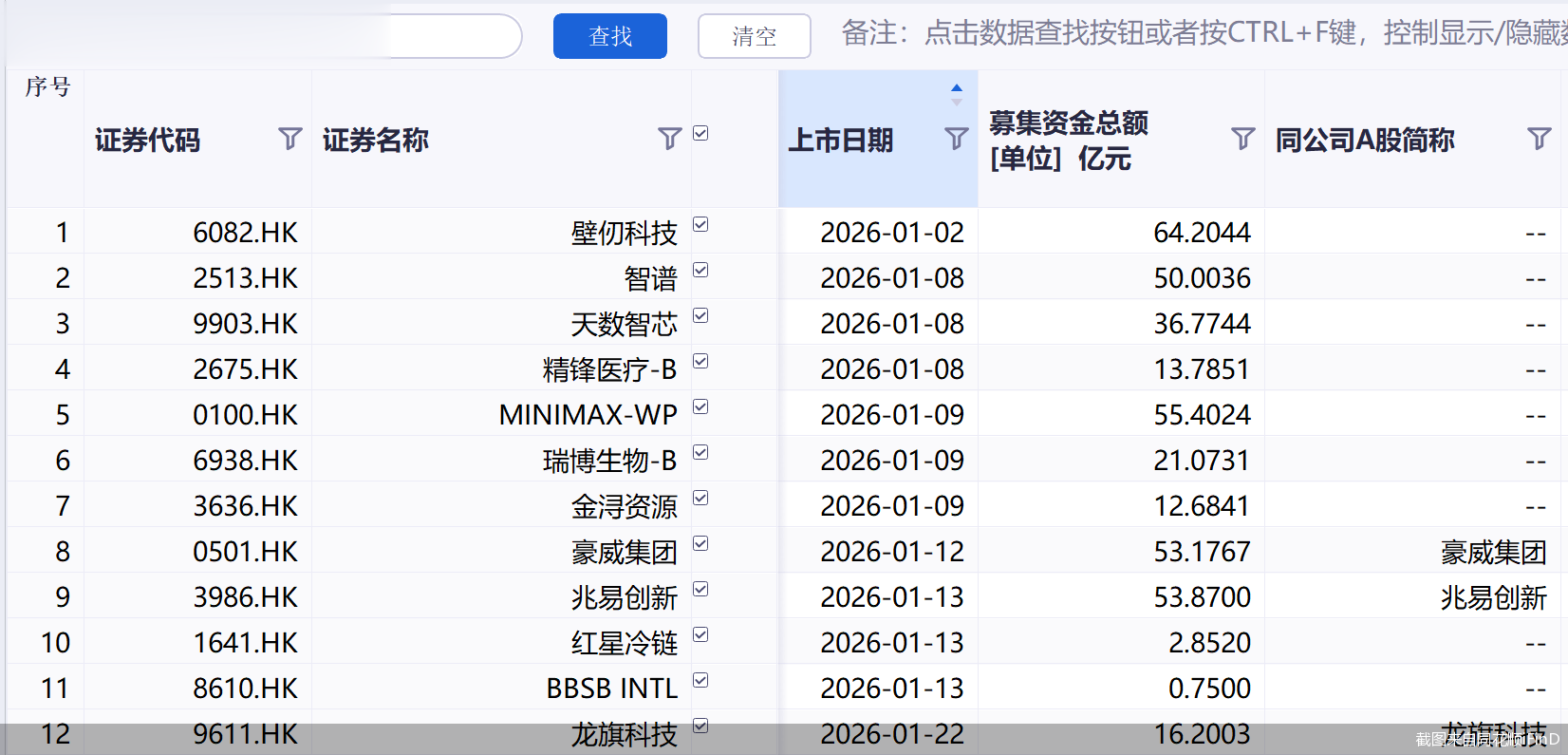 经计算,24只港交所新股的募集资金额合计达892.26亿港元,较去年前2个月80.12亿港元的募资总额相比增长1013.65%。