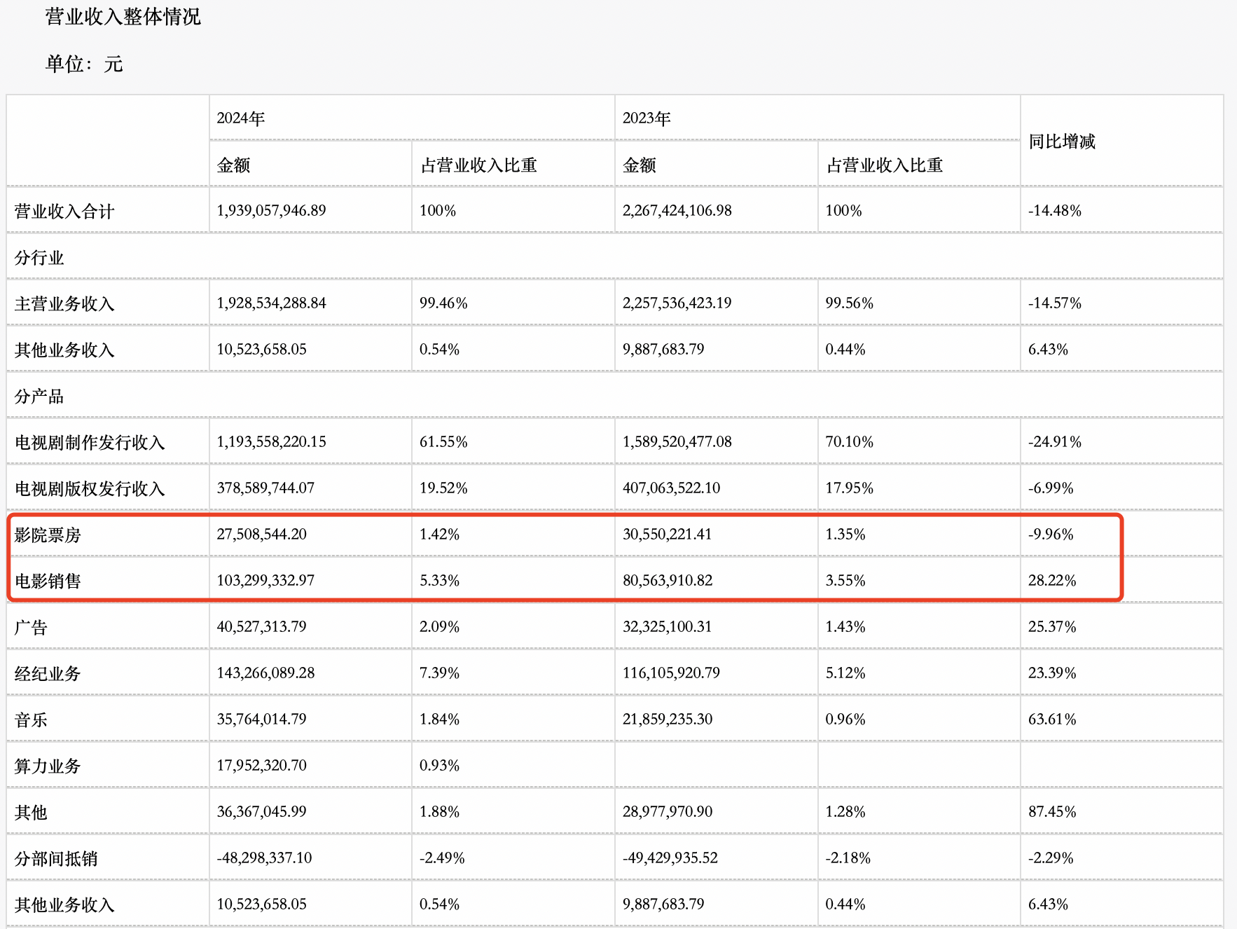 目前,电影和影院业务收入在华策影视的营收占比较低。界面新闻查询华策影视2024年年度报告获悉,该年其电视剧制作和版权发行收入合计占比超过81%,影院票房和电影销售业务的收入仅占总营收的6.75%。其中,影院票房的收入同比下降了近10%。