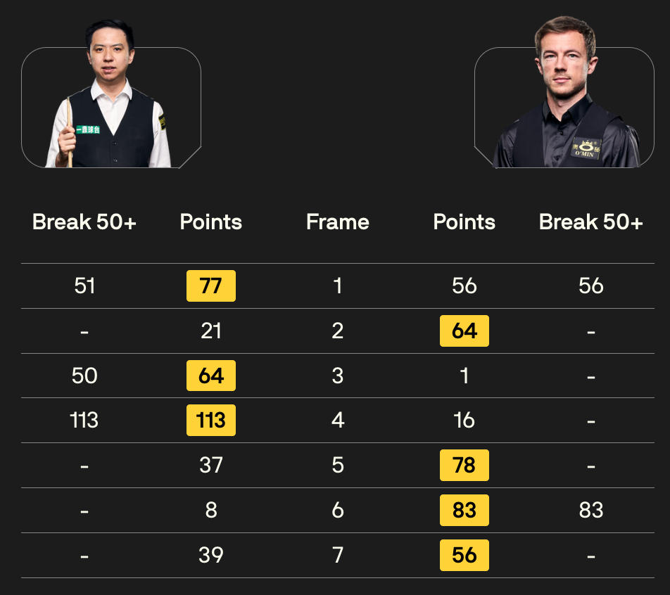 全场比赛,利索夫斯基打出两杆50+(56、83),肖国栋打出一杆113分和两杆50+(51、50)。