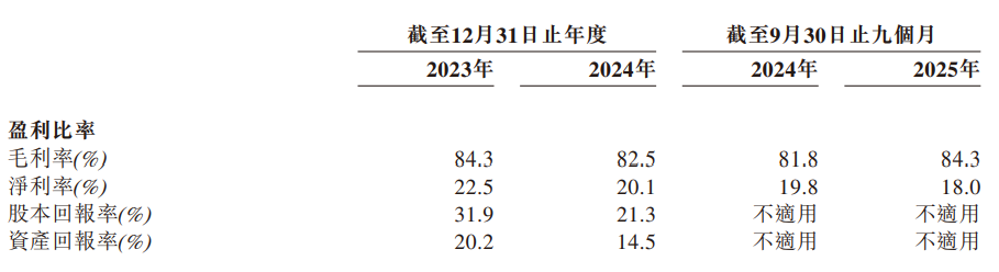 于2023年、2024年及2025年截至9月30日止九个月,该公司毛利率分别为84.3%、82.5%、84.3%。
