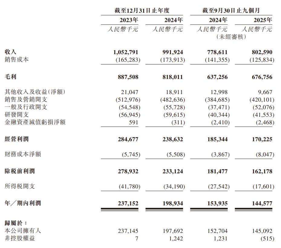 于2023年、2024年及2025年截至9月30日止九个月,该公司实现收入分别约为10.53亿元、9.92亿元、8.03亿元人民币。