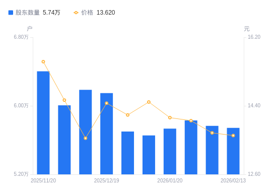 日期A股户数(户)流通A股户均持股数(股)户均持股市值(万元)2026-02-135743010960.9414.932026-02-105766710915.8914.942026-01-305829410798.4815.132026-01-205734410977.3815.472026-01-095654011133.4816.142025-12-315699811044.0215.642025-12-196148510237.9714.812025-12-106186510175.0913.792025-11-286006310480.3615.252025-11-20640369830.1215.30